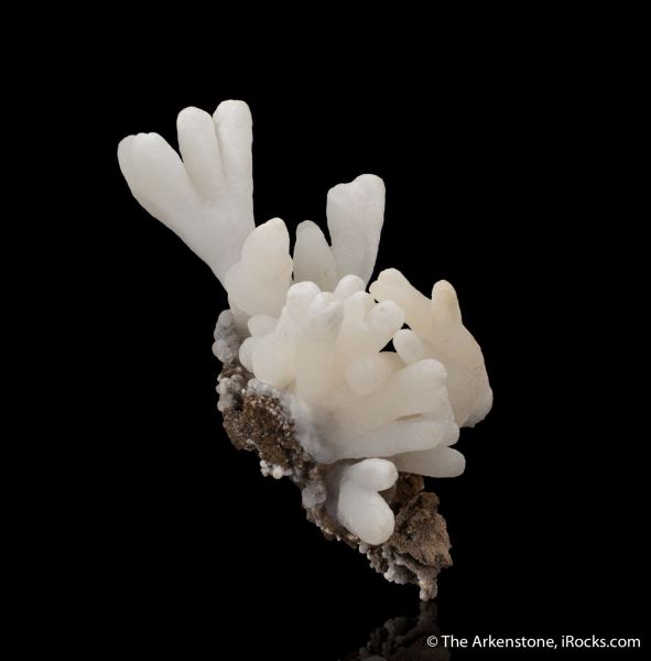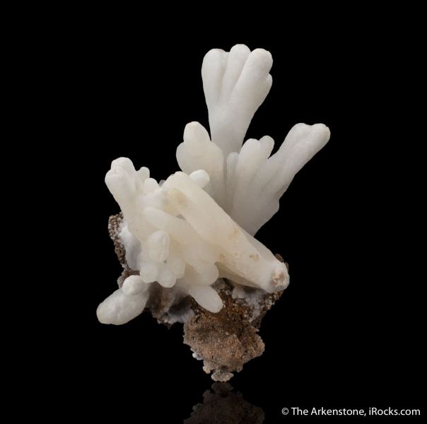 This is a Calcite stalactites from Xin Yang Mine, Minggang Co., Henan Prov., China. An unusual specimen consisting of a cluster of ghostly white, twisting stalactites of calcite on matrix.Data last checked on 29th Jul 2024 - specimen may no longer be available