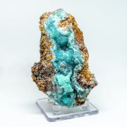 This is a Aurichalcite from UludaÄ Mine, Bursa Prov., Turkey. This cool combo piece features balls of blue-green aurichalcite up to 0.5cm associated with small balls of brown calcite and thin blades of white/pale blue aurichalcite.Data last checked on 29th Jul 2024 - specimen may no longer be available