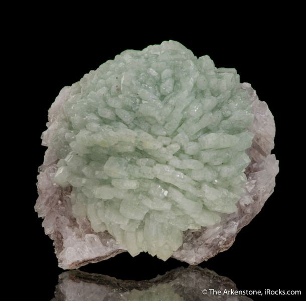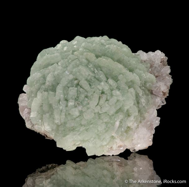 This is a Prehnite on Quartz from El Hammam Mine, Khemisset Cercle, Rabat-Sale-Kenitra Region, Morocco. Prehnites from El Hammam are known for this distinct habit in which well defined crystals align to form rounded, uniform clusters.Data last checked on 26th Aug 2024 - specimen may no longer be available