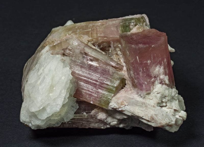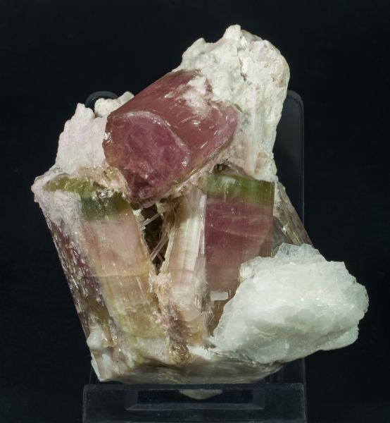 Triad of Elbaite crystals, doubly terminated, with a gradation of pink tones, turning into a greenish green-cap towards the end, covered and partially cemented by a feldspar and with leafy snow-white Albite crystals (variety cleavelandite) at one end. From a mining district renowned for its gems and lithium minerals.The specimen comes from the Moutet collection, in Marseille, and is accompanied by an old Deyrolle label, which we will send to the buyer of the piece.