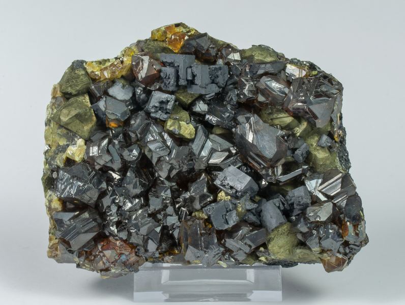 Druse of twinned Sphalerite crystals with very well defined faces and edges, translucent, very bright and with dominant orange tones, with yellow reflections. On matrix, with small Galena crystals and twinned Chalcopyrite crystals. An American classic from a locality from which it is currently very difficult to obtain good specimens.Commodore Mine, Creede District, Mineral County, Colorado USA