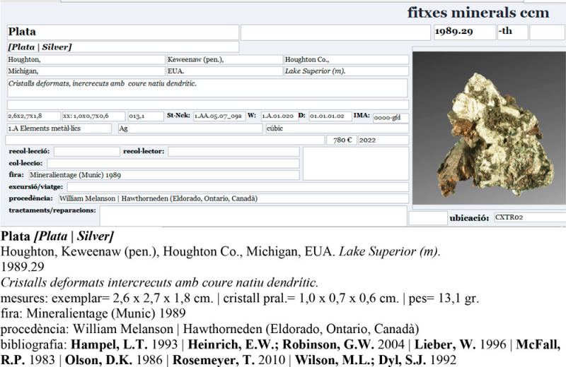 Silver crystals with polycrystalline growths and discernible crystal forms, interspersed with an arborescent growth of Copper. A classic and, at the same time, a rarity from the USA.The specimen comes from the collection of duplicates of Carlos Curto (number 1989.29), whose label we will send to the buyer.