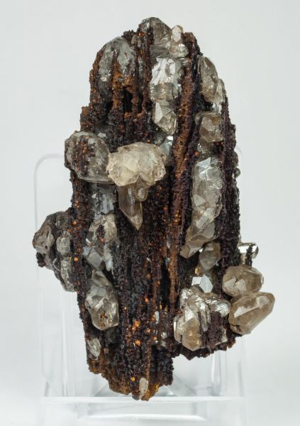Twinned Cerussite crystals with very well defined crystal forms, between transparent and translucent, lustrous, and covering a stalactitic growth of limonite. Not so common in this quality from the Ojuela Mine.It comes from the Santiago Jiménez collection, which not only had specimens from Spain but also a good representation of minerals from all over the world.