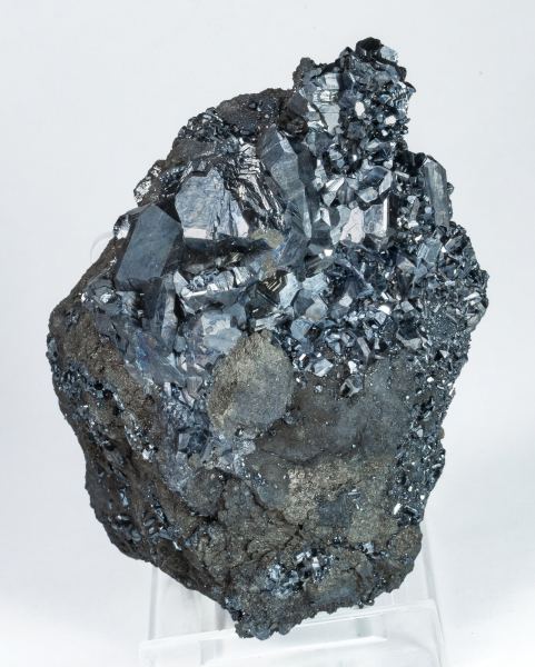 Very sharp crystals of Chalcocite, of very good size, twinned, with faces and edges very well defined, flattened, very lustrous, and on a Pyrite matrix.The specimen has been analyzed and we will send a copy of the analysis to the buyer.
