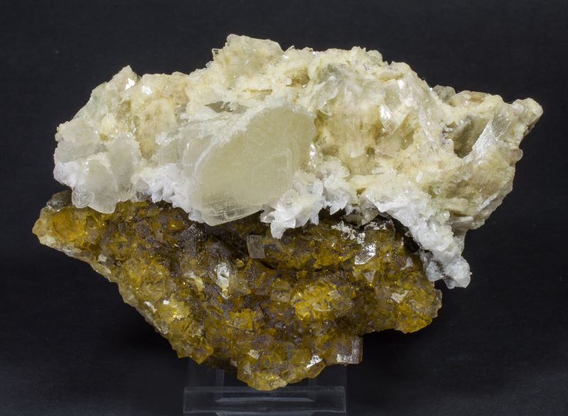 Cream-colored Calcite crystals with a lenticular shape, one of them clearly dominant, with transparent tabular Baryte crystals with a yellow color instead of the more frequent blue. Also white rhombohedral Dolomite crystals and a matrix of transparent Fluorite crystals with an intense yellow color, with fine coatings of metallic sulphides.Moscona Mine, El Llano, Solís, Corvera de Asturias, Comarca Avilés, Principality of Asturias (Asturias) Spain (2019)