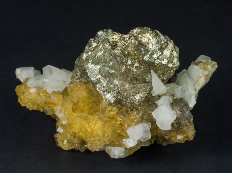 Pineapple growth of deformed cubic Pyrite crystals with curvatures, striations and other growth forms, on matrix, with white rhombohedral Calcite crystals, and cubic Fluorite crystals which are transparent, with good luster and an intense yellow color. The specimen is not from the classic Moscona mine, but rather from the Villabona mines.Villabona Mines, Barrio de la Estación, Villabona, Llanera, Comarca del Nora, Principality of Asturias (Asturias) Spain (1993)
