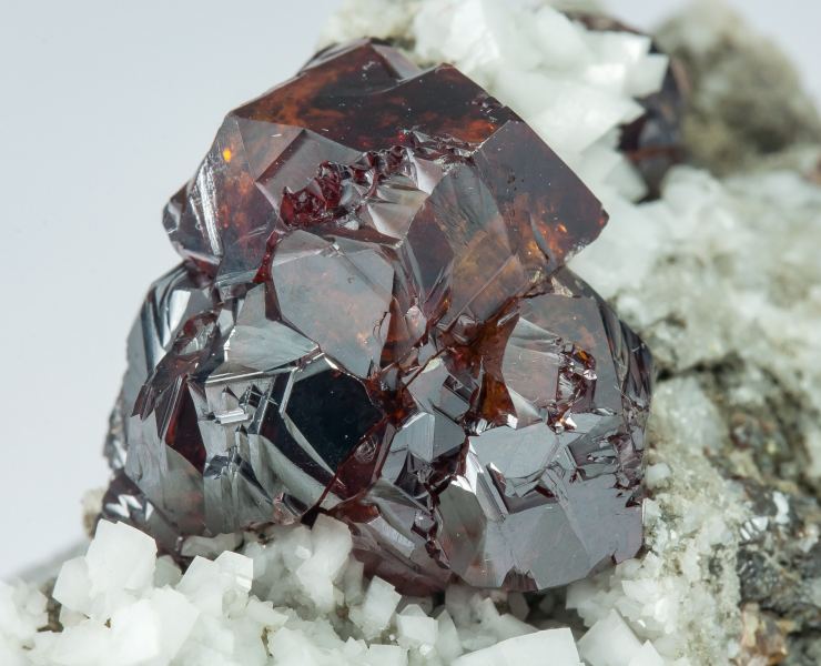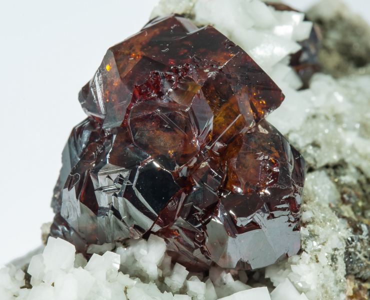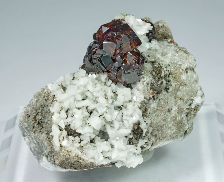 A powerful piece. Perfectly sharp and outlined Sphalerite crystal group, of complex and twinned crystallography, of very deep toasted honey color, transparent and implanted in a rock matrix, on very well defined Dolomite crystals with a snow-white color and small crystals of Calcite.The specimen comes from the Antonino Bueno collection whose label we will send to the buyer.