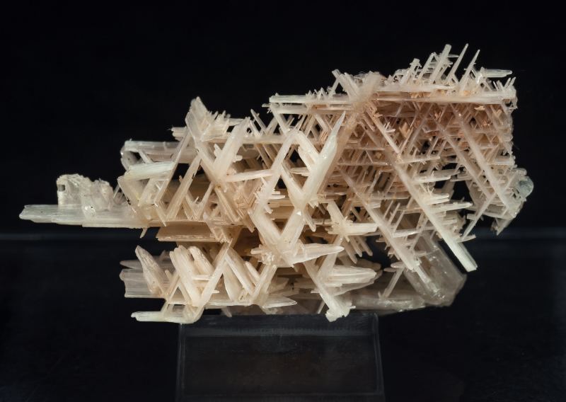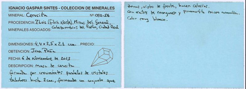 Very aerial, reticulated growth of flattened and twinned prismatic Cerussite crystals with a white color. The specimen comes from the collection of Ignacio Gaspar Sintes (number CER-56) whose label we will send to the buyer.Luis Mine, Norte vein, Del General Mines, Cabezarrubias del Puerto, Comarca Valle de Alcudia, Ciudad Real, Castilla-La Mancha Spain (06/11/2013)