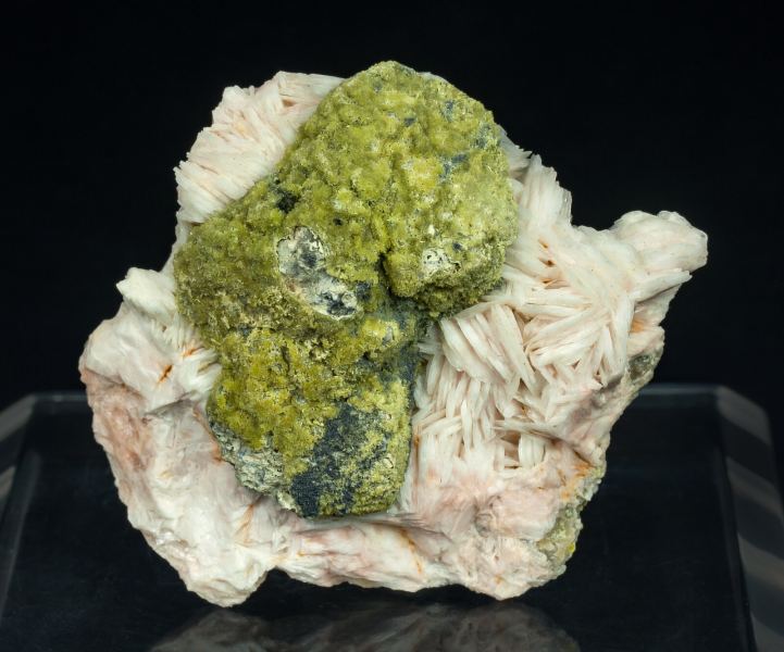 An important discovery in 2015 at the well-known Atrevida mine revealed a unique pocket with coatings of very sharp millimetric Mimetite crystals, translucent, greenish yellow in color, formed by an elongated prism and an acute bipyramid. Mimetite almost completely covers the cubic Galena crystals that are implanted in a matrix covered with aggregates of white lenticular Baryte crystals.The specimen comes from the collection of Andrés Jiménez Shelly.