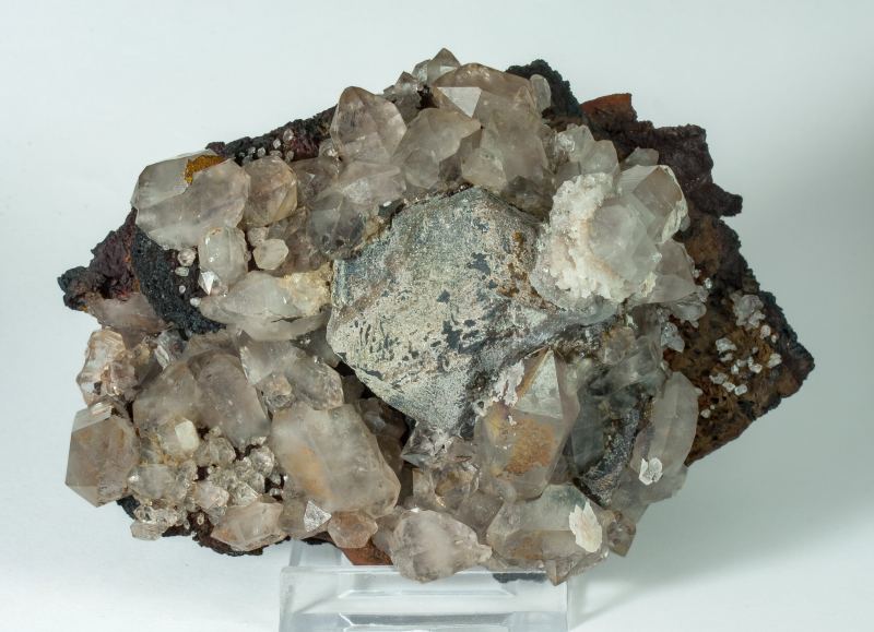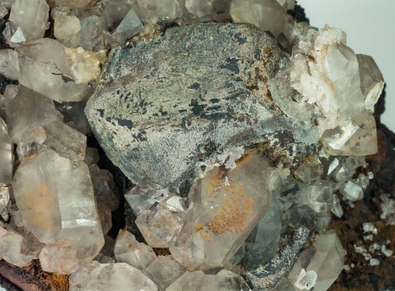 Cubo-octahedral crystal of Galena, of considerable size, partially covered by a multitude of tiny Cerussite crystals, hosted in a matrix formed of iron-rich Dolomite and associated with a large group of Quartz crystals, some of them doubly terminated.A curious specimen due to its genetics and for being from the Rómulo mine in the La Unión-Cartagena mining district, very difficult to get nowadays.