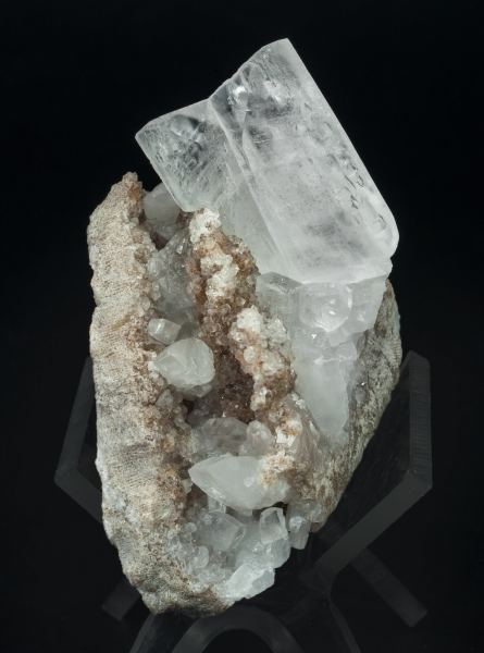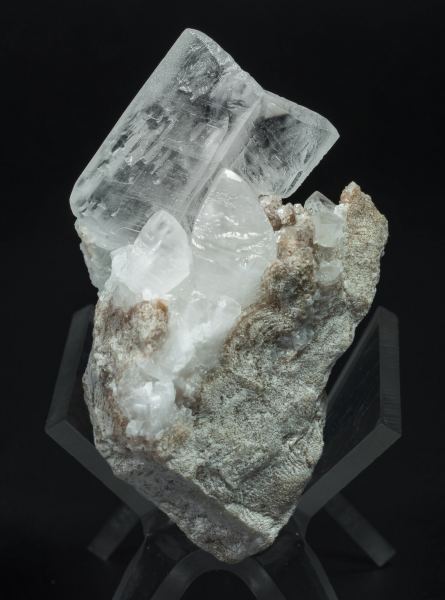 Calcite crystals, one of them clearly dominant and very aerial on the matrix, with a very evident, transparent, lustrous and colorless contact twin.The specimen, from a quarry little known for twinned specimens, comes from the collection of Andrés Jiménez Shelly.
