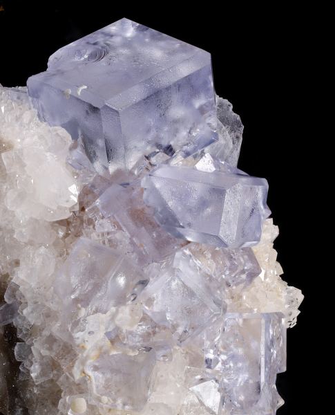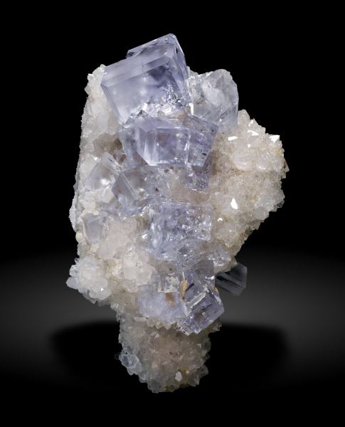Very aerial group of Fluorite crystals beveled by dodecahedron faces, transparent, with great luster and a pale blue color. On a matrix of small Quartz crystals.Llamas Quarry, Obdulia vein, Caravia mining area, Las Cabañas, Duyos, Caravia, Comarca Oriente, Principality of Asturias (Asturias) Spain (2022)