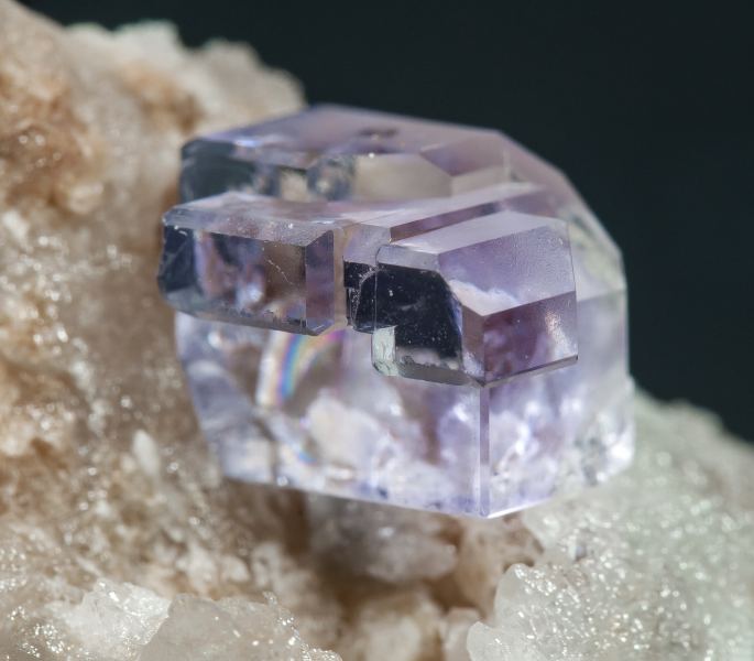 Fluorite crystals with the cube faces clearly dominant and with distinct beveling by rhombododecahedron faces. Transparent, shiny, pale lilac in color and on a matrix of white scalenohedral Calcite crystals.Llamas Quarry, Obdulia vein, Caravia mining area, Las Cabañas, Duyos, Caravia, Comarca Oriente, Principality of Asturias (Asturias) Spain