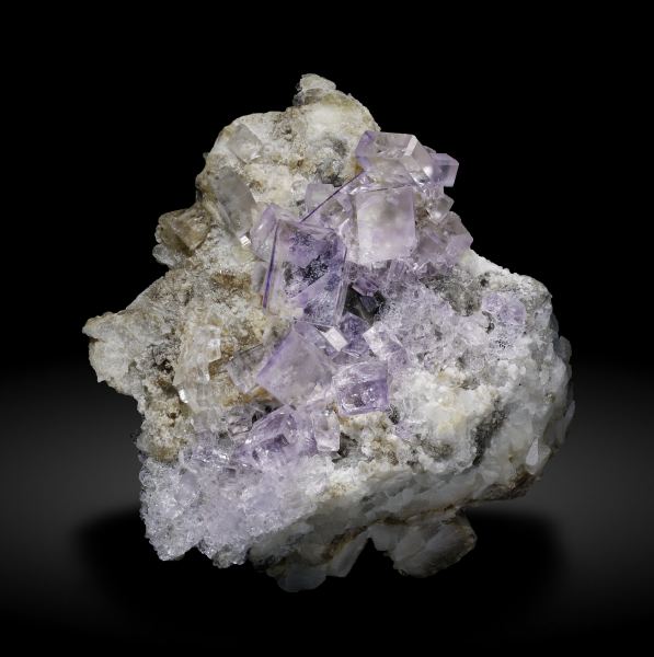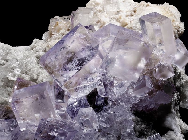 Fluorite crystals with the cube faces clearly dominant and with distinct beveling by rhombododecahedron faces. Transparent, shiny, pale lilac in color, on a matrix of white scalenohedral Calcite crystals.Llamas Quarry, Obdulia vein, Caravia mining area, Las Cabañas, Duyos, Caravia, Comarca Oriente, Principality of Asturias (Asturias) Spain (2022)