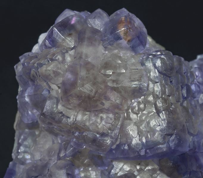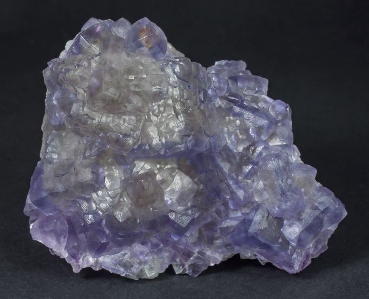 Aggregate of Fluorite crystals of complex crystallography where cubic and tetrahexahedron forms dominate, with geometric color zoning trending towards mauve on the edges of the crystals, very deep in some areas, and yellowish green tones towards the center of the crystals.From a classic deposit for Asturian mineralogy, the San Lino cut, closed in 1986. The specimen comes from the Alain Martaud collection.