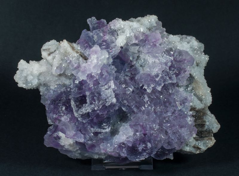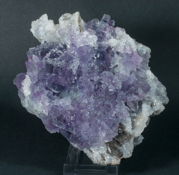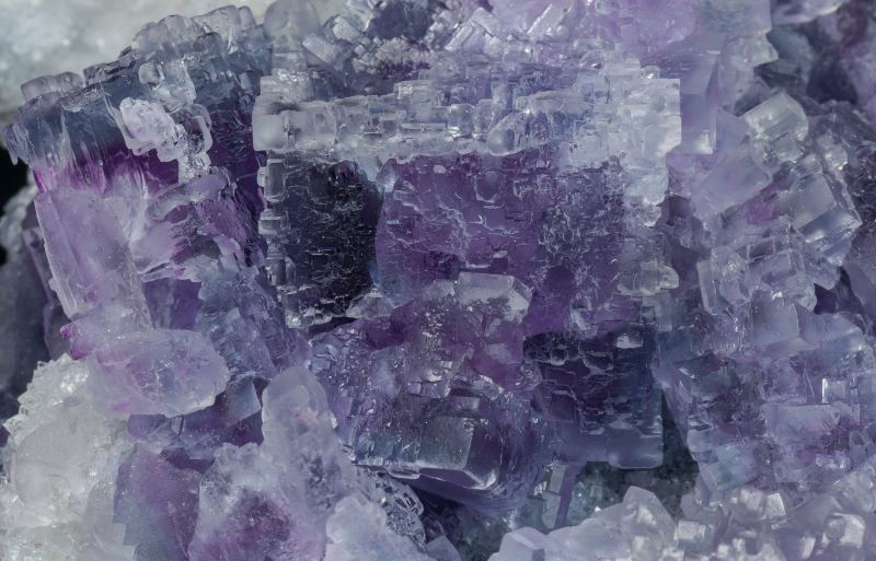 Druse of Fluorite crystals with a cubic habit, with very deep dissolution forms that seem to outline the edges of an old large crystal that has disappeared. Transparent, with a marked geometric color zoning which varies from lilac to intense violet and with small coatings of Quartz crystals.Berbes mining area, Berbes, Ribadesella, Comarca Oriente, Principality of Asturias (Asturias) Spain