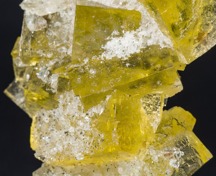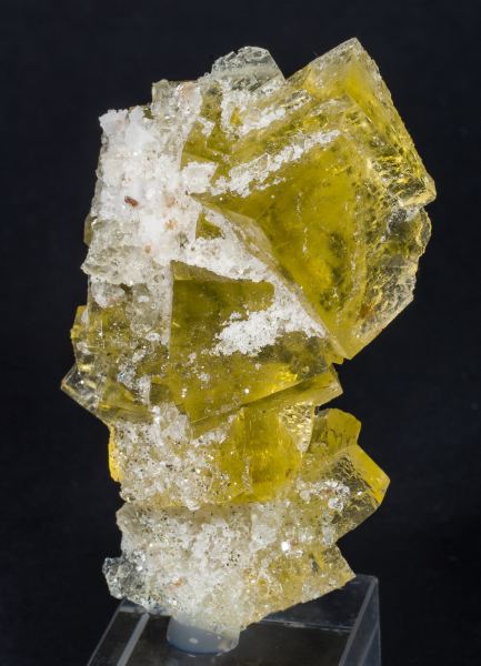 Group of sharp Fluorite crystals of very good size for the locality. They are between transparent and translucent, with good luster and an intense yellow color, with inclusions and coatings of lamellar Baryte crystals.This specimen comes from the Miguel David Martínez collection (number 797), whose label we will send to the buyer.