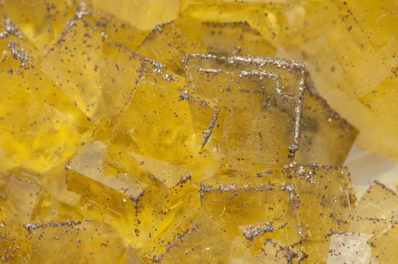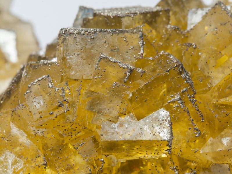 Druse of very sharp Fluorite crystals, transparent, with good luster and an intense honey-yellow color with a very evident geometric zoning outlined by oriented Pyrite inclusions, especially on the edges.Moscona Mine, El Llano, Solís, Corvera de Asturias, Comarca Avilés, Principality of Asturias (Asturias) Spain (2019)