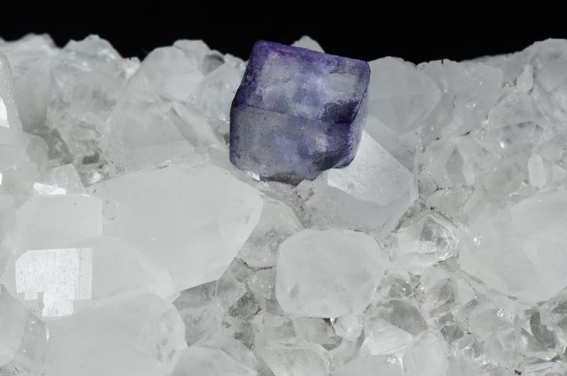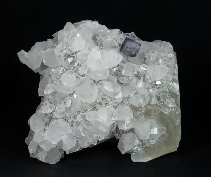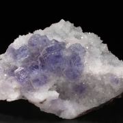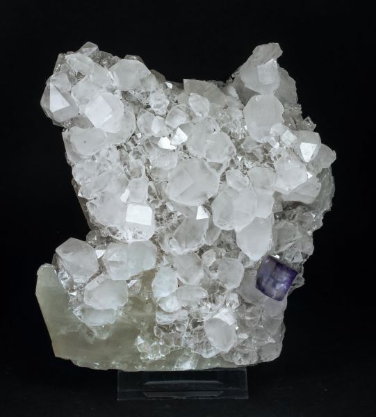 Druse of Quartz crystals, larger than usual for the locality, which cover a matrix of crystalline Calcite. On the Quartz there is a Fluorite crystal, very aerial, transparent and with very marked geometric color zoning, much more intense on the edges.La Viesca Mine, La Collada mining area, Huergo, Siero, Comarca Oviedo, Principality of Asturias (Asturias) Spain (±2007)