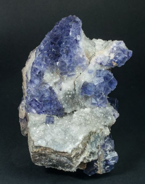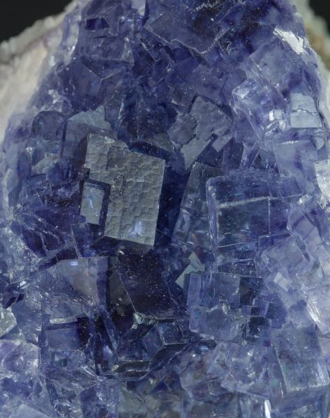 Group of Fluorite crystals finely beveled by dodecahedron faces, transparent, with good luster and an intense and uniform blue color with lilac tones and geometric color zoning. They grew on a limestone matrix with a layer formed by white Quartz crystals. From the prolific La Viesca mine, which closed since 2021.La Viesca Mine, La Collada mining area, Huergo, Siero, Comarca Oviedo, Principality of Asturias (Asturias) Spain (2007)