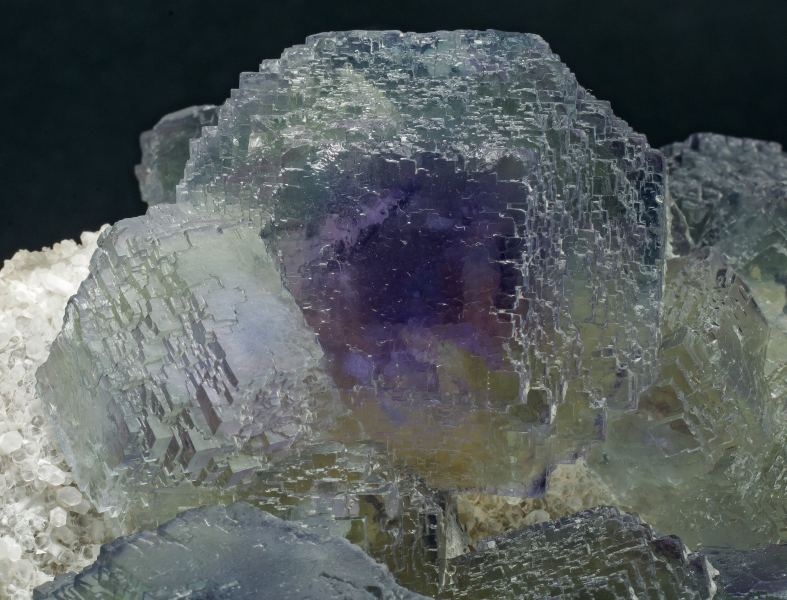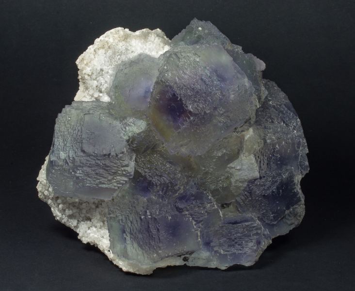 Druse of Fluorite crystals with smooth cube faces and dodecahedron forms with fine polycrystalline growths. They are translucent, violet in color with bluish areas and sit on a matrix with small white Quartz crystals.La Viesca Mine, La Collada mining area, Huergo, Siero, Comarca Oviedo, Principality of Asturias (Asturias) Spain