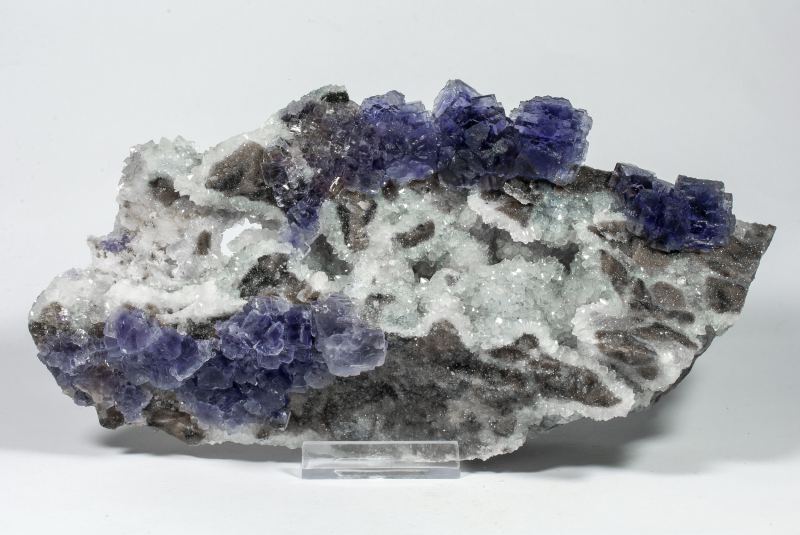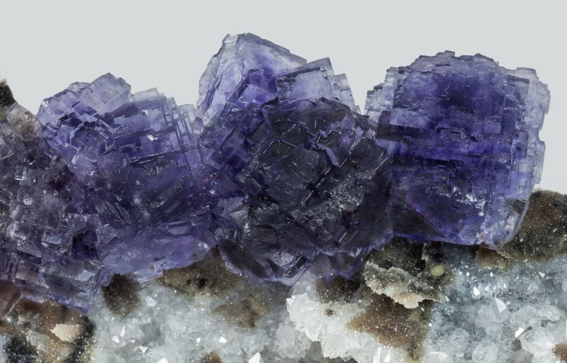 Very aerial groups of Fluorite crystals with smooth cube faces, beveled by dodecahedron faces and with polycrystalline growths. Translucent, with good luster, a very deep and intense color and with geometric color zoning. On matrix partially covered by Quartz crystals.La Viesca Mine, La Collada mining area, Huergo, Siero, Comarca Oviedo, Principality of Asturias (Asturias) Spain (±2010)