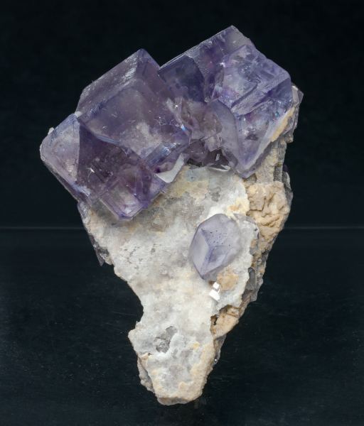 Very sharp Fluorite crystals with a cubic habit beveled by dodecahedron faces, transparent, lustrous, violet in color, on a Calcite matrix.From a classic Spanish locality from which it is very difficult nowadays to obtain specimens.