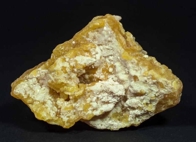 Sulphur crystal of rhombic morphology with irregular faces and rounded edges, with an intense and uniform yellowish tone, partially carpeted by whitish, opaque to semi-translucent Celestine crystals, a typical association for these mineral species at this classic Italian deposit. The specimen comes from the old collection of Robert-Auguste Touchon and is accompanied by a handwritten label that will be sent to the buyer.