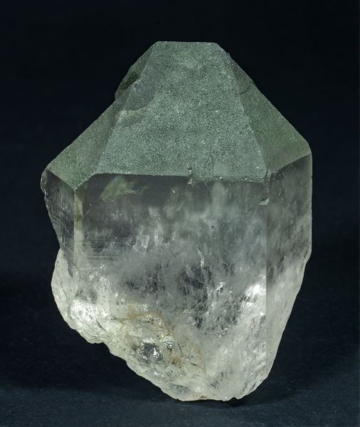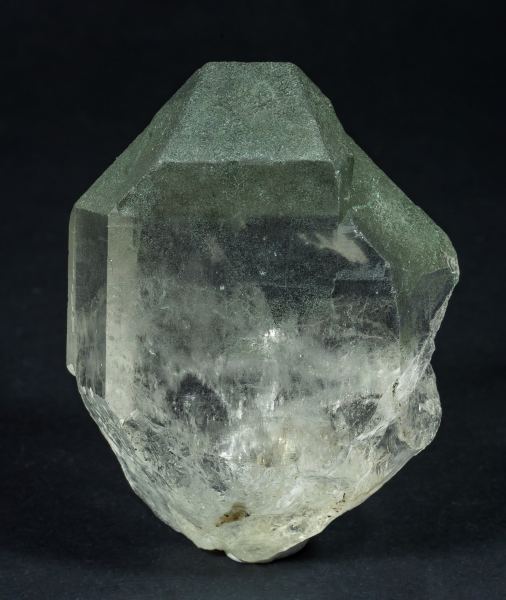 Doubly terminated and slightly flattened Quartz crystal, with well defined faces and edges, between transparent and translucent, completely covered by Chlorite microcrystals on the upper termination. The specimen, an Italian alpine classic, comes from the old collection of Robert-Auguste Touchon.
