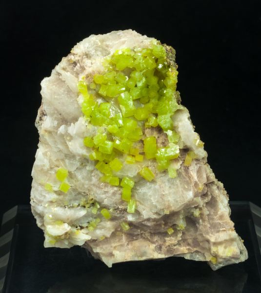 Group of Pyromorphite crystals with a marked hexagonal outline and short prism with equant habit, very lustrous,with a glowing apple-green color, on a matrix formed of superimposed lamellar Baryte crystals. From the Realces pocket in the classic San Andrés Mine in Cordoba.
