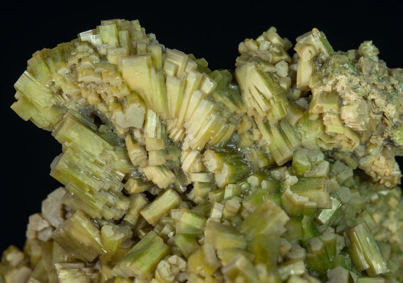Group of Pyromorphite crystals, on matrix, with an elongated habit, hexagonal shape, and hopper terminations, some grouped as parallel growths and others divergent and with a little bit greener color than the specimens previously known from this locality. Comes from an old lead mining area that was already being exploited in Roman times.Resuperferolítica claim, Cerro de la Canaleja, Santa Eufemia, Comarca Los Pedroches, Córdoba, Andalusia Spain