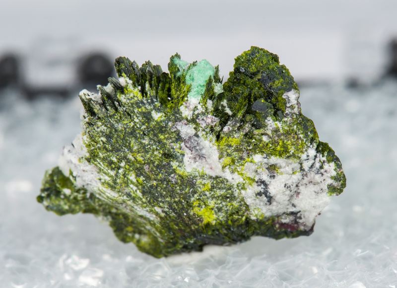 Small rosette aggregate of Volborthite crystals with a deep olive-green color, on matrix with small whitish Dickite remnants and with small fibrous Malachite crystals with a lighter green color in the center of the piece. These Volborthites were the great sensation at Tucson and Sainte Marie in 2015, despite the fact that the number of specimens found was quite limited. Currently the mine from which this specimen comes is closed.Milpillas Mine, level 26, Cuitaca, Municipio Santa Cruz, Sonora Mexico(04/2015)