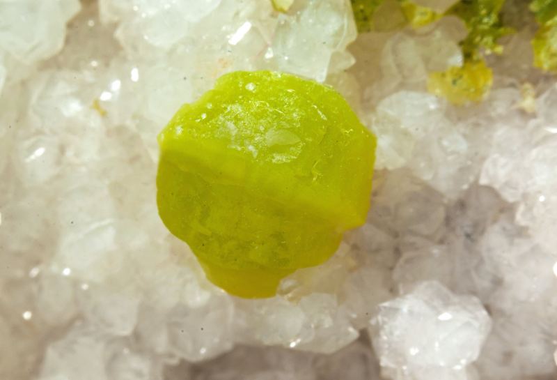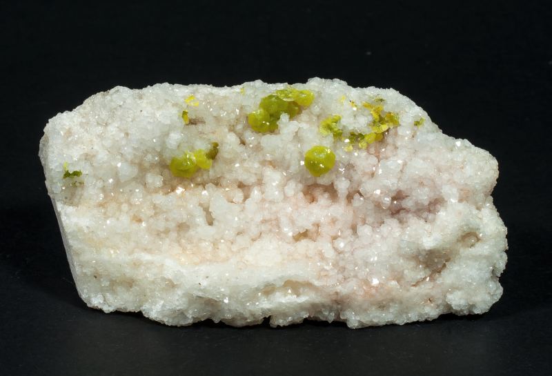 Druse of Quartz crystals without a developed prism, adorned with globular growths of lustrous and very isolated Pyromorphite crystals with a greenish yellow color.La Vidale Mine (Brezies), Asprières, Saint-Martin de Bouillac, Villefranche-de-Rouergue, Aveyron, Occitanie France(03/2011)