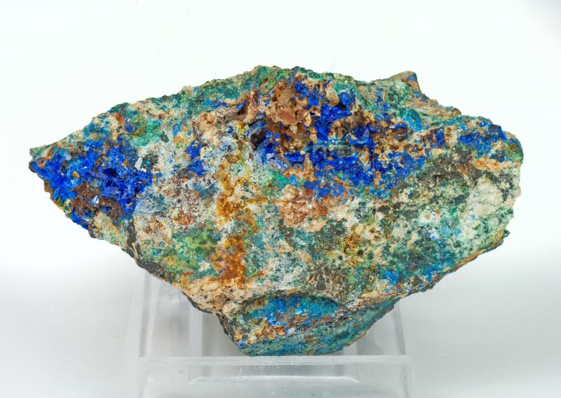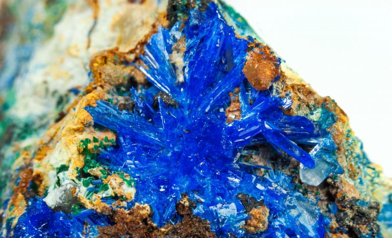 Fan-shaped aggregate of very sharp acicular Linarite crystals, with good luster and a very vivid color. On a limonite matrix with green Brochantite crystals. The presence of a terminated Caledonite crystal of light blue color stands out in the best crystallized area of the specimen. An interesting combo of secondary copper minerals.King Arthur Mine, Kirki Mines, Évros Prefecture, Thrace (Thráki) Department Greece (03-04/2013)