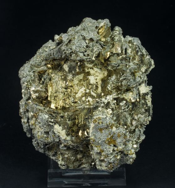 Two generations of Pyrite crystals, an older generation of shiny crystals of cubic habit, one of them clearly dominant in the center, with marked curvatures on the edges and polycrystalline growths, and that has been partly covered by a tapestry of Calcite crystals with a fine outer layer of bluish tones. The second generation of Pyrite crystals has a much more vivid color and golden reflections, deposited on the limestone, with the crystals being smaller than those of the first generation.The Trepča mining complex is one of the largest polymetallic deposits in the world and for many years produced exceptional specimens of Sphalerite as well as various combinations of sulphides and carbonates, as shown in this specimen from the former collection of Ferat Voca.