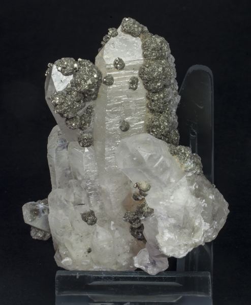 Group of Quartz crystals, one of them clearly dominant and upright in the center of the piece, with marked growth striations on the prism, terminated and partially covered by rosettes of cubic Pyrite crystals. The Trepča mining complex, from where this specimen comes, is one of the largest polymetallic deposits in the world, from the former collection of Ferat Voca.Stan Trg (Stari Trg) Mine, Trepča Complex, Trepča Valley, Kosovska Mitrovica, Kosovska Mitrovica District Kosovo(2000-2021)