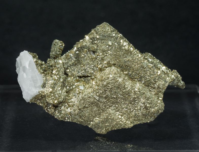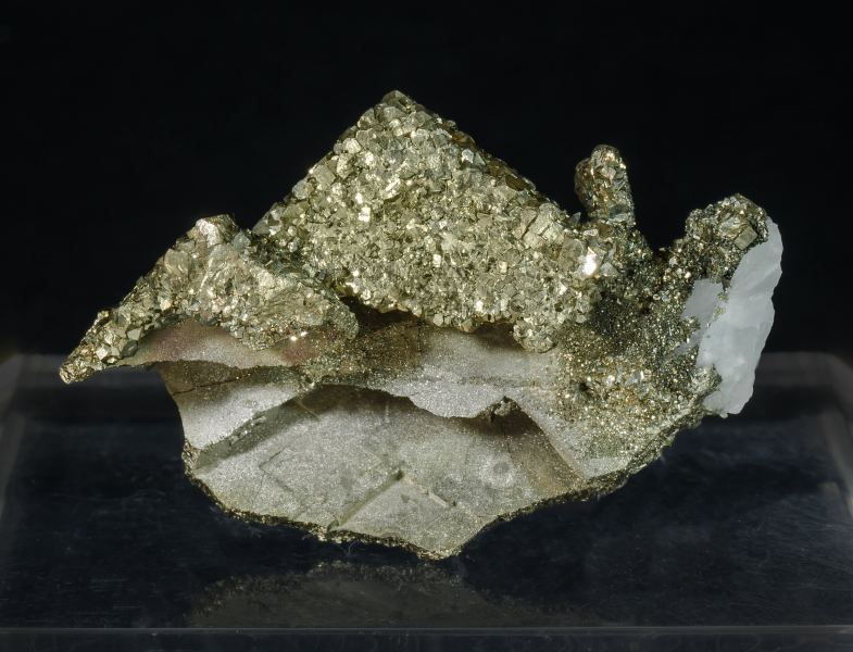A novelty from Morocco, from a discovery in the summer of 2020. White tabular crystals of Baryte partially covered by a perimorphic growth of a mosaic of very lustrous small cubic and octahedral Pyrite crystals. The Bou Nahas Mine, a polymetallic hydrothermal deposit, continues to provide pleasant mineral surprises.Bou Nahas Mine, Oumjrane mining area, Alnif Commune, Tinghir Province, Drâa-Tafilalet Region Morocco(07/2020)