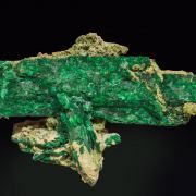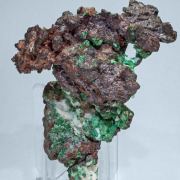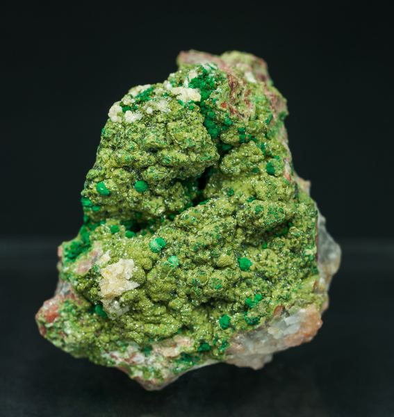 Globular Duftite aggregates with a uniform pistachio-green color, partially covering a rock matrix, along with scattered spherical aggregates of grass-green malachite. The Tsumeb mine the origin of this piece- is the type locality (TL) for Duftite. The specimen comes from the former collection (duplicates) of Carles Curto (number 1982.19), whose label and computer file we will send to the buyer.