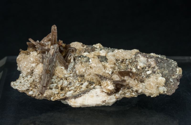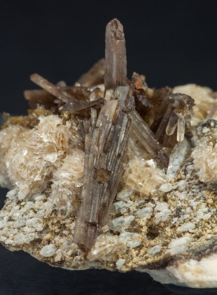 Very sharp crystals of Childrenite with acute terminations, some of them doubly terminated, translucent, lustrous, and brown in color. On matrix and with cream-colored crystals of Roscherite. Small doubly terminated Quartz crystals with parallel orientations, and snow-white Feldspar aggregates, complete the combo. The specimen comes from a pegmatite hosted in granite. Both species, the Childrenite and the Roscherite, have been analyzed and we will send a copy of the analysis to the buyer.