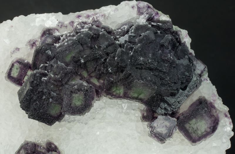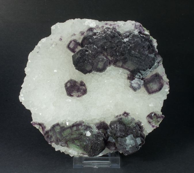 Rounded druse of Quartz crystals without development of the prism, with a snow-white color, on which Fluorite crystals of cubic morphology have been deposited. Translucent, with polycrystalline growths on the faces and edges showing a geometric color zoning with greenish cores and deep lilac edges. Comes from a mine that has provided excellent specimens of Fluorite worldwide.Yaogangxian Mine, Yizhang, Chenzhou Prefecture, Hunan Province China(±2006)