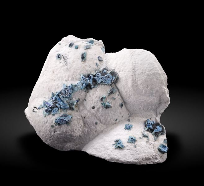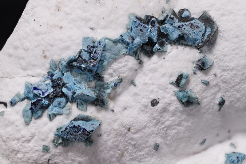 Crystals of Henmilite, a rare hydrated borate of Ca and Cu, on an Olshanskyite matrix. They are very sharp and are very intense blue in color despite being partially covered by a thin layer of a mixture of minerals, among which Calcite predominates and among which there is also a currently unidentifiable copper silicate, and it can not be ruled out that it could be a new mineral phase.The analyses carried out attest to this mixture of species in the coating. We will send a copy of the analysis to the buyer.