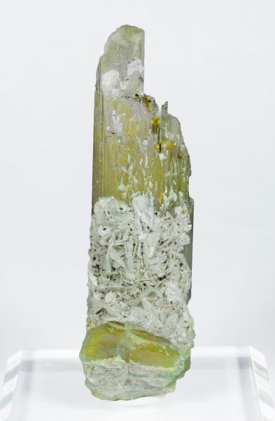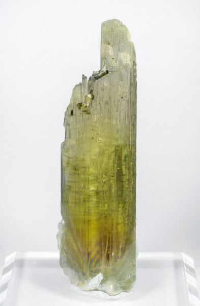 Floater crystal of Diaspore, doubly terminated and twinned, with parallel growths and excellent terminations. Very transparent and limpid, lustrous, and of a peculiar yellow color with green reflections, partially covered by lamellar Margarite crystals, and with some small Ilmenite crystals too.Ilbir Mountain, Pinarcik, Milâs District, Muğla Province, Aegean Region Turkey (11-12/2020)