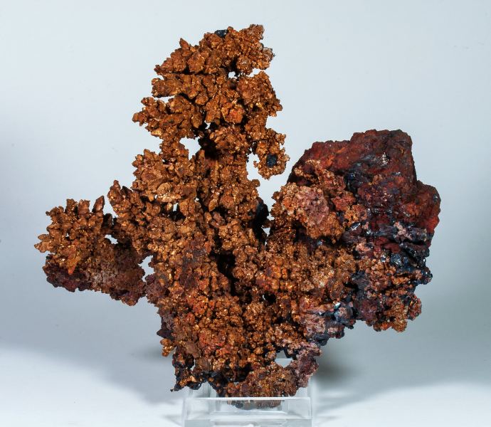 Arborescent aggregate of native Copper, very aerial, with well defined crystals for the species, with good luster and partially coated by very sharp octahedral Cuprite crystals, lustrous and deep red.Liufengshan Mine, Guichi District, Chizhou Prefecture, Anhui Province China (06/2022)