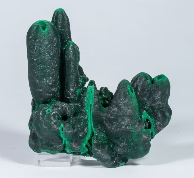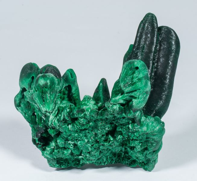 Columnar and stalactitic growths, very aerial, of Malachite, with the intense silky sheen typical of specimens from this locality, which gives them a peculiar "chatoyant" appearance. Deep green in color, it also has some curious concretionary Malachite growths with a much lighter tone, with small recrystallized holes in the terminations, probably due to very rapid growth.Shilu Mine, Yangchun, Yangjiang Prefecture, Guangdong Province China (±1995)