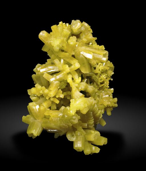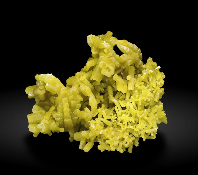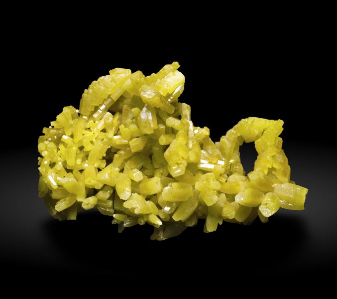 Very aerial group of Pyromorphite crystals with a short prismatic habit, many of them totally or partially doubly terminated, with bright luster and a very vivid and uniform yellowish color. Different from what usually appears in Daoping and of excellent quality.This piece comes from the Philippe Morelon collection, whose label we will send to the buyer.