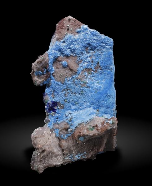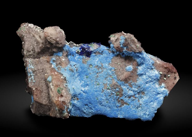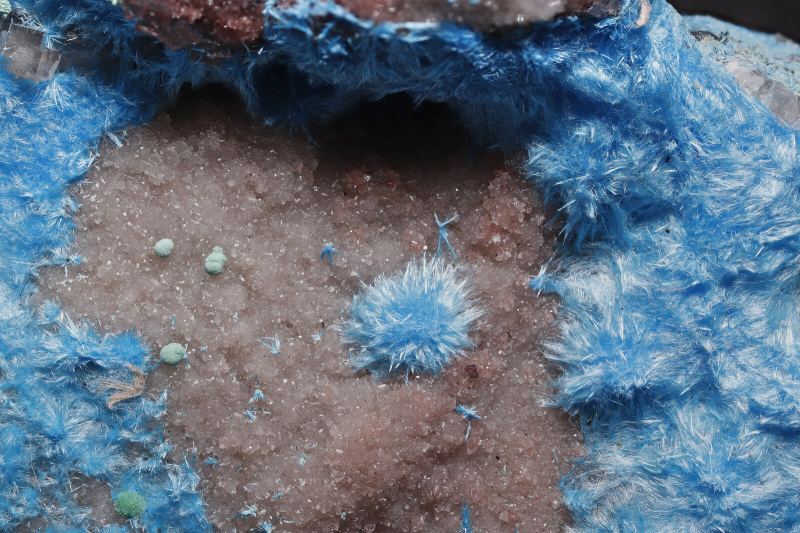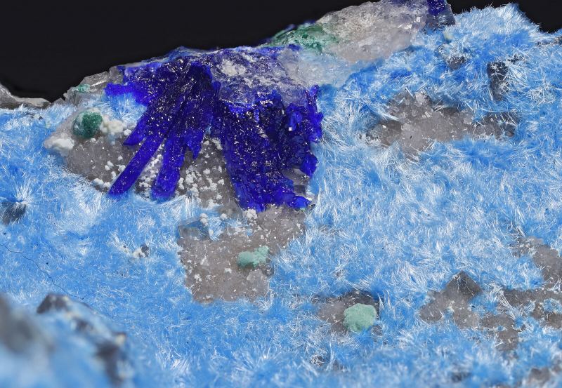 Felty aggregates of filiform crystals of Carbonatecyanotrichite, a different species from the better known Cyanotrichite, with an intense and uniform blue color. They are on matrix, with Calcite and small Azurite crystals that add a little something different from the usual.Qinglong Mine, Dachang, Qinglong, Qianxi'nan Autonomous Prefecture, Guizhou Province China