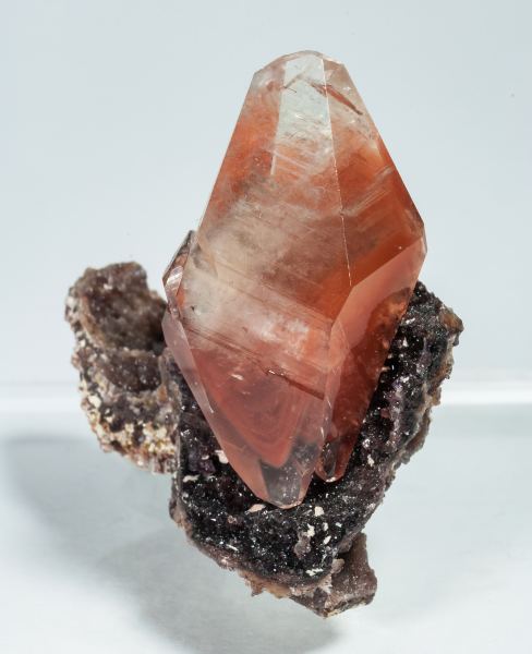 Doubly terminated scalenohedral Calcite crystal, on matrix, transparent and extraordinarily lustrous, with reddish inclusions of iron oxides. A miniature of great quality and very aesthetic.Tonglüshan Mine, Edong, Daye, Huangshi Prefecture, Hubei Province China (2022)