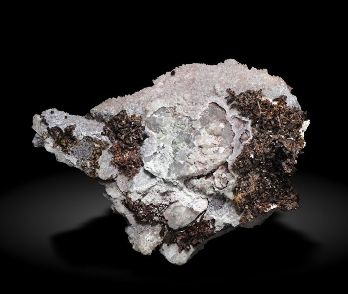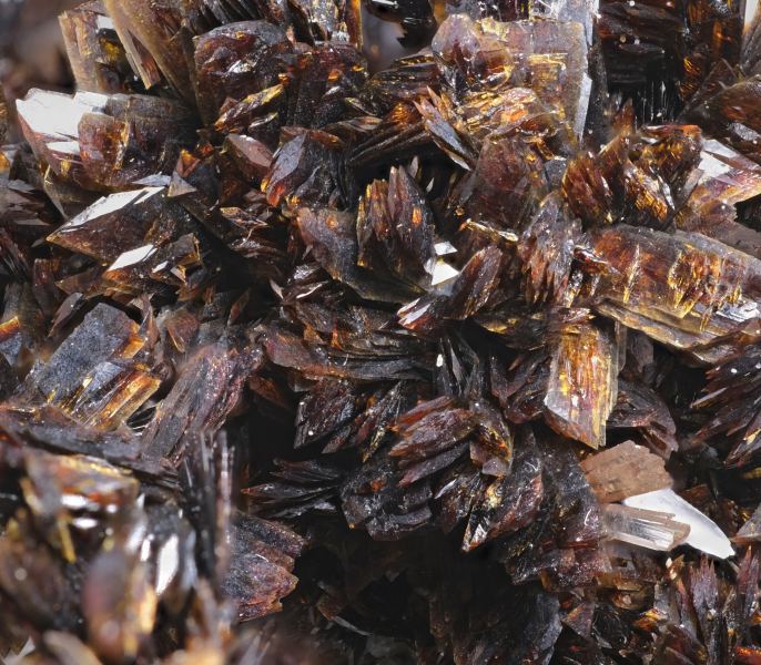 Groups of very sharp Hubeite crystals much larger than usual for what was known up to now for the species, with good luster and a dark reddish brown color, implanted on a matrix with white rhombohedral Calcite crystals.Fengjiashan Mine, Edong, Daye, Huangshi Prefecture, Hubei Province China (±2001)