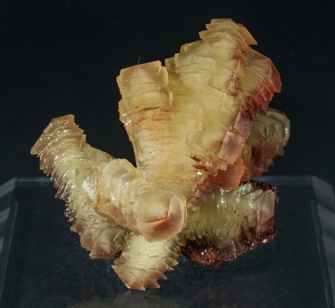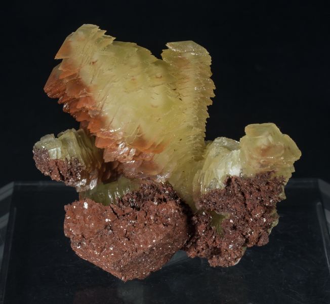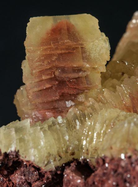 From a 2022 discovery in the Daye area, parallel growths of lenticular and very aerial Calcite crystals forming stacks, on matrix. They are translucent, lustrous, yellow with red Hematite inclusions and geometric color zoning that gives a very aesthetic result.Daye mining area, Edong, Daye, Huangshi Prefecture, Hubei Province China (03/2022)