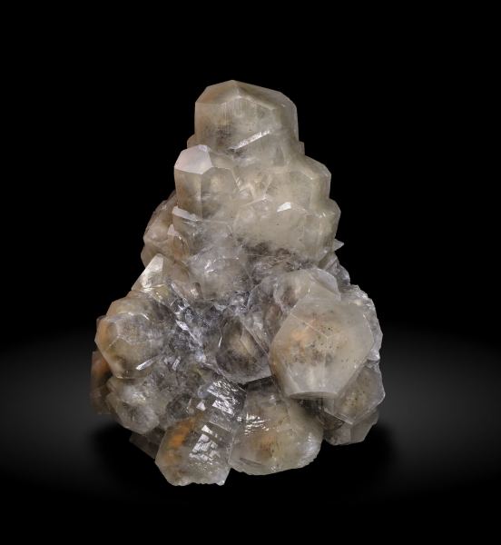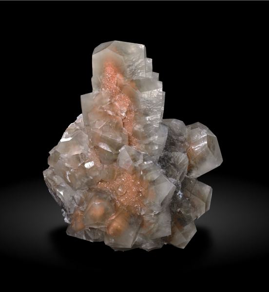 Parallel growths of Calcite crystals with very sharp prism forms, terminated by flattened rhombohedron faces, transparent, lustrous, with very pronounced phantom growths, colorless and with pink inclusions.Leiping Mine, Leiping, Guiyang, Chenzhou Prefecture, Hunan Province China